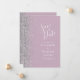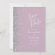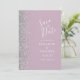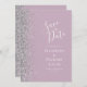 Le bord gauche de cet élégant mariage moderne, à l'exception de la carte de date, comporte une bordure en faux parties scintillant argent. Le texte personnalisable combine écriture blanche, copperplate et polices italiques sur un arrière - plan lilas poussiéreux. L'envers présente un design lilas et argent poussiéreux assorti.