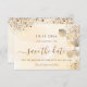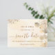 Un arrière - plan doré à l'eau décoré de feuillage d'eucalyptus doré et de poussière de parties scintillant en faux or. Personnalisez et ajoutez la date, le lieu et vos noms. Lettres de couleur dorée. Le texte : Save the Date est écrit avec un grand script de style à la main tendance.