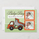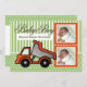 Adorable Faire-part de naissance bébé avec benne, brosses et pois en vert et orange pour votre nouveau bébé garçon. Personnalisable avec deux photos. Beaucoup de place pour le texte à l'arrière.