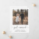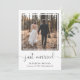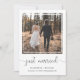 Faire-part de mariage simple et chic ou annonce de mariage intime et invitation à une réception ou une fête après le mariage. Le devant présente votre photographie dans un cadre carré découpé, "juste mariés" écrit dans un script tendance avec enjolivures et vos prénoms, date et lieu de mariage dans une typographie moderne. Au verso, vous pouvez personnaliser votre annonce de mariage avec plus de détails, ajouter une invitation à une réception ou une fête et signer vos noms de mariés dans un script ressemblant à une signature.