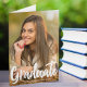 Diplômé est écrit en écriture blanche manuscrite sur votre photo de portrait senior fait une carte d'annonce de remise de diplôme pliée chic et moderne. Personnalisez avec votre nom et votre lycée ou université promotion 2025 sous la typographie grasse et ajoutez vos coordonnées au verso de ces élégantes cartes de diplômé avec superposition de texte.
