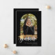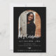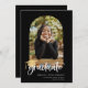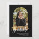 Script blanc jouant avec accent de capuchon de graduation doré, arche cadre 2 photo graduation faire-part/invitation. Caractéristiques, arrière - plan de couleur noire.