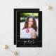 Moderne Elegant Script Graduation Photo avec un élégant script manuscrit avec une photo de taille sur le devant et une photo carré sur le dos, le tout sur un arrière - plan noir moderne, mais tous le texte et les couleurs sont entièrement personnalisables - parfait pour vos annonces de graduation élégantes simples. Veuillez nous contacter à cedarandstring@gmail.com si vous avez besoin d'aide pour la conception ou les produits correspondants.