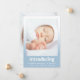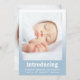 Annonce de naissance de bébé garçon personnalisée avec une photo sur la couverture sur un fond dégradé de bleu et blanc, et une photo plus grande au dos. Le prénom de votre fils dans une police moderne blanche ainsi que son nom de famille et les informations de naissance sous 'Présentation' dans une police sérif rétro. Belle annonce de naissance pour bébés garçons.