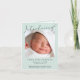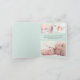 Une simple carte de faire-part de naissance pliée vert menthe pastel neutre pour le genre. Le recto présente la photo de votre nouveau-né, son nom complet, sa date d'arrivée et ses statistiques de naissance, ainsi que l'"introduction" écrite dans un script élégant se terminant par un choc cardiaque. À l'intérieur de la carte, ajoutez trois photos supplémentaires et un remerciement personnalisé ou un autre message, avec place pour une note manuscrite à gauche.
