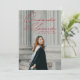 Faire-part de graduation moderne avec la photo verticale du diplômé avec "En avant et en haut" dans une écriture manuscrite rouge. Personnalisez le devant du faire-part de remise de diplômes en y ajoutant le nom du diplômé, l'école et l'année de fin d'études. Le faire-part inverse pour afficher une photo supplémentaire avec les plans futurs du diplômé, les détails de la fête de grad, etc. montré ci-dessous.