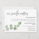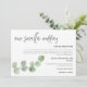 Pour les moments où une cérémonie de mariage plus petite et socialement distante est essentielle et que vous souhaitez faire savoir à vos invités que vous réduisez la taille et les invitez à la diffusion en direct à la place, ce design contemporain présente une élégante branche de feuilles d'eucalyptus dans le coin inférieur gauche et un script élégant et moderne avec "Notre petit mariage" en haut. Le reste du texte, qui est aligné à droite, vous pouvez facilement le personnaliser avec vos informations. Vous pouvez également changer la couleur de fond verte coordonnée au verso en une autre couleur si vous le souhaitez via l'option "Personnaliser davantage".
