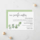 Pour les moments où une cérémonie de mariage plus petite et socialement distante est essentielle et que vous souhaitez faire savoir à vos invités que vous réduisez la taille et les invitez à la diffusion en direct à la place, ce design contemporain présente une élégante branche de feuilles d'eucalyptus dans le coin inférieur gauche et un script élégant et moderne avec "Notre mariage intime" en haut. Le reste du texte, qui est aligné à droite, vous pouvez facilement le personnaliser avec vos informations. Vous pouvez également changer la couleur de fond verte coordonnée au verso en une autre couleur si vous le souhaitez via l'option "Personnaliser davantage".