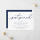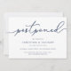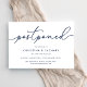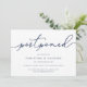 Besoin de reporter votre mariage ou de changer la date ? Faites-le savoir à vos invités avec ces cartes de report de mariage simples et élégantes. Le design chic bleu marine et blanc présente "reporté" en haut en écriture calligraphiée à la main, avec vos noms et la nouvelle date en dessous. Ajustez la formulation et le niveau de détail selon vos besoins. Comme indiqué, le texte exemple dirige les invités vers votre site web de mariage pour plus d'informations.