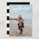 Script Lettrage à la main photo verticale Enregistrer l'annonce de la date. Une photo entièrement personnalisable sauvegardez l'annonce de la date pour votre famille et vos amis. Cette verticale enregistrer la carte date dispose de lettrage blanc simple et de motif à rayures noir et blanc. Vous pouvez également customiser le dos de la carte de faire-part en changeant le motif avec votre photo ou une autre image.