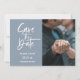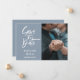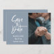 Écriture blanche moderne, Mariage Enregistrer le Carte photo de date. Caractéristiques, élégants arrière - plans de couleur bleu poussiéreux et modèle photo simple devant.