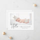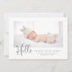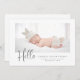 Une carte simple et élégante photo modèle de naissance faire-part recto-verso comprend une photo de votre nouveau-né garçon ou fille, message personnalisé qui peut être personnalisé, texte de typographie écrit à la main qui dit "Bonjour" avec un script merci et coeur entre - au-dessus de votre message sur le dos. Vous pouvez customiser le nom et les statistiques du bébé à l'avant et vous remercier du message au dos de la carte. Un endroit pour une deuxième photo à l'arrière. ©Marisu Valencia