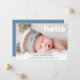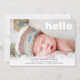 Annoncez la naissance de votre fils avec cette photo personnalisée moderne carte de faire-part bébé garçon. Ce modèle design simple présente une photo à l'avant de la carte avec le mot "bonjour" en typographie blanche. Ci-dessous, le nom et les détails de naissance de votre bébé en bleu et gris texte. Le dos de la carte est bleu. Félicitations pour votre nouveau paquet de joie ! Conçu par l'artiste ©Susan Coffey.
