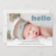 Annoncez la naissance de votre fils avec cette photo personnalisée moderne carte de faire-part bébé garçon. Ce modèle design simple dispose d'une photo sur le devant de la carte avec le mot "bonjour" dans la typographie bleue. Ci-dessous, le nom et les détails de naissance de votre bébé en bleu et gris texte. Le dos de la carte est bleu. Félicitations pour votre nouveau paquet de joie ! Conçu par l'artiste ©Susan Coffey.