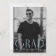 Faire-part de graduation simple avec la photo verticale du diplômé avec "Grad" affichée en lettres bleu clair, art déco moderne. Personnalisez l'avant du faire-part de remise de diplômes en photo unique en ajoutant le nom du diplômé, son école et son année d'études. La faire-part s'inverse pour afficher un design tourbillon géométrique bleu ciel et blanc.