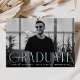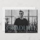 Faire-part de graduation simple avec la photo horizontale du diplômé avec "Graduate" affichée en bleu ciel, lettres art déco moderne. Personnalisez l'avant du faire-part de remise de diplômes en photo unique en ajoutant le nom du diplômé, son école et son année d'études. La faire-part s'inverse pour afficher un design tourbillon géométrique bleu ciel et blanc.
