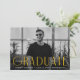 Faire-part de graduation simple avec la photo horizontale du diplômé avec "Graduate" affichée en lettres jaunes et modernes art déco. Personnalisez l'avant du faire-part de remise de diplômes en photo unique en ajoutant le nom du diplômé, son école et son année d'études. La faire-part s'inverse pour afficher une conception géométrique tourbillon jaune et blanc.