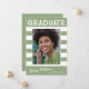 Cartes photos de graduation rétro, rayés et tendance, avec des éléments de design de texte rétro avec écriture manuscrite. La photo des diplômés est accentuée de rayures blanches audacieuses. Le dos de la carte offre des espaces de texte personnalisés pour des informations sur votre graduation et votre futur voyage. Écriture blanche sur un vert sage clair chic ou customisez facilement l'arrière - plan pour correspondre à la couleur primaire de votre école ou toute couleur de votre choix. Parfait pour les diplômes du lycée, du collège et de l'université.