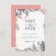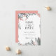 Cadre moderne en feuilles de palmier tropiques, enregistrer la carte de date. La carte présente des feuilles tropicaux peints en aquarelle tendance en vert rose corail et argent, un design typographique élégant et un support couleur rose corail assorti.