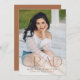 Annoncez votre diplôme de fin d'études secondaires ou collégiales avec ce faire-part moderne. Le faire-part de graduation affiche "Grad" en lettres brun-argile tendance avec l'année de graduation affichée à l'intérieur de la lettre 'd'. Personnalisez l'avant du faire-part avec la photo, le nom et l'école supérieurs verticaux du diplômé. Le faire-part s'inverse pour présenter une photo supplémentaire affichée à l'intérieur d'un cadre de carré blanc avec votre message ci-dessous.