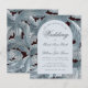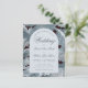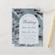 Une invitation de mariage à petit budget qui combine des éléments vintage et modernes. Sur un fond de feuilles d'acanthe gris-bleu sur fond noir (un motif vintage de William Morris, désormais dans le domaine public), il y a une arche blanche avec du texte à l'intérieur. Le mot Mariage et les noms sont écrits dans un élégant script calligraphique, la première ligne est un texte arqué.