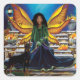 A fairy with orange and yellow wings sitting on stone steps that lead to perhaps the Fairy realm. The African American Fairy is not alone, she is with her guardian doberman dog on this Autumn Day.