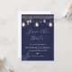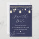 Mason Jar + fairy lights wedding save the dates with an elegant blue rustic feel!