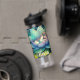 Personalized fairy water bottle. Cute little fairy sleeping on a lotus flower on a lily pad with flowers and mushroom background. Cute fairytale style illustration.