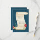 Carte de réponse mariage à thème Imaginaire faite dans un look cuir bleu, avec des graphiques d'un défilement parchemin. Des fleurs rouges colorées et de la verdure ornent le bas du parchemin. Personnalisez le texte pour votre jour de mariage. Des produits mariages Fairytale correspondants sont disponibles.