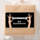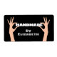 Paire de mains tenant le mot "fait main" avec nom personnalisé. La couleur Arrière - plan peut être modifiée.
