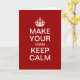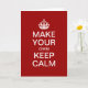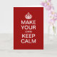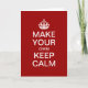 Une carte de voeux modèle que vous pouvez utiliser pour faire facilement votre propre Keep Calm et Carry On Parody. Tout le texte peut être modifié, re-dimensionné ou supprimé. La couronne peut également être modifiée. Montré avec un arrière - plan rouge. Vous pouvez le modifier en n'importe quelle couleur en appuyant sur le bouton "customiser". Permet de faire une carte complètement customisée. L'intérieur de la carte a été laissé vide pour que vous puissiez ajouter votre propre message.