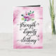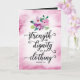 Wish a special lady a happy birthday with this unique calligraphy style typography design with the title, "Strength and dignity are her clothing. Proverbs 31:25" Design appears on purple watercolor background with floral accent in top centre of card. Inside front has pink watercolor background and on right inside, your background includes a chalk effect with script type and flower accents. The Inside message (which can be customized to fit your needs, reads), "A woman like you, who loves God and lives a life of goodness and truth, deserves to be celebrated, applauded and honoured. I hope your birthday is filled with God's richest blessings! HAPPY BIRTHDAY!