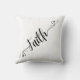 The Faith & Hearts Pillow features a minimalistic design that includes the word "Faith," which has curly lines on the beginning and end of the word. The curly lines include some small hearts as an added flourish.