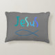 A basic pillow of faith in greens and blues it says simply "Jesus" with the christian symbol of the fish. I love the simplistic design and each side is a different shade of background greys. Share this with family and friends of faith a good gift for all.
