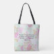 The front of the tote features a beautiful Pink Rose in bloom, processed in an artsy style; the back of the tote has a complementary colour toned floral pattern with Scripture from Psalm 103:22 so either side can be shown.