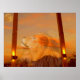 A lion looking up at a full moon on a sunset sky poster.