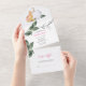 New modern botanicals tri-fold invitation in a contemporary design. Details are set in a trendy hand letter script typography in vibrant pink with a traditional serif face font. A replica of my original hand painted tropical monstera leaves and red fox with white pumpkin top your baby shower details. Customize each flap with your personal information. Perfect for tropical fall baby showers and girl backyard bbq baby showers. To see more baby shower inspiration and Thanksgiving baby announcement ideas by Victoria Grigaliunas visit www.zazzle.com/dotellabelle