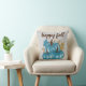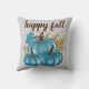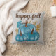 Cute seasonal Fall pumpkins throw pillow! Modern script typography quote says "happy fall". With three colourful blue pumpkins and autumn leaves. Soft grey background. Get nice and cozy this Fall!