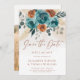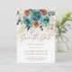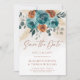 This Fall Teal Burnt Orange Botanical Floral Wedding save the date photo card captures the essence of autumn with a boho botanical floral border featuring watercolor roses and wedding foliage in the rich, warm tones of teal and burnt orange. The inviting design is complemented by a pale watercolor texture, evoking the crisp air and golden hues of fall. Ideal for couples planning a rustic, garden wedding, or an intimate backyard celebration, this invitation suite perfectly reflects the cozy and romantic atmosphere of the autumn season, blending romantic artistry with elegant simplicity for any venue.