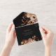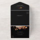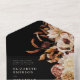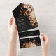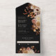 Fall Botanical Wedding All in One Invitation. This elegant all-in-one wedding invitation features hand-painted watercolor burnt orange and terracotta leaves, cream and beige dahlias, and beautiful rust-coloured roses on a black background. RSVP is included with this stylish invite. Find matching items in the Black Autumn Romance Collection.
