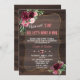 Rustic, Romantic card design featuring watercolour burgundy blush flowers bouquets, a semi-transparent shape with a textured frame, arrows with hearts and flowers as divider, all on an old barn background. Use Personalize tool to add your info. Matching items can be found in my Charming Floral Collection.