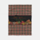 Add a warm cozy Autumn touch to your room, with this lovely Fall colours fleece blanket. Done in a brown, rust, green, and tan plaid pattern, with graphics of colourful fall leaves, against a black band, decorates the middle of the blanket. Personalize the rust and green text, on the black band, to suit your needs. Three sizes available.