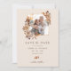 This elegant save the date card features a beautiful watercolor terracotta, brown, and taupe floral wreath on a taupe background with a photo of the bride and groom.