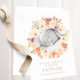 A pretty birth announcement card for your fall arrival featuring your favourite photo of your little one in a floral wreath with purple, terracotta and peach flowers.