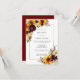 Golden sunflowers, dark red roses and ivory white hydrangea flowers are nestled in autumn leaves and berries. They decorate a gold frame that surrounds your hen party details. The back of the bridal shower invitation is deep burgundy red.