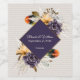Fall themed stylish wedding wine bottle label done in an ivory faux corrugated like texture. A brown framed purple diamond shaped text area, has purple and golden yellow flowers with pampas grass and colourful feathers, decorating the top and bottom. Personalize all the text for your special day. Matching products are available.