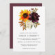 A pretty fall bouquet of a yellow sunflower, purple peony and white hydrangea tops this modern wedding invitation. It is part of the Sunflower and Burgundy collection.