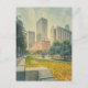 The image shows a cityscape in San Francisco, featuring tall buildings and palm trees. A park area is visible in the foreground, covered with yellow autumn leaves. The sky is overcast, creating a muted, slightly vintage atmosphere. The buildings are a mix of modern skyscrapers and older, red-brick structures.