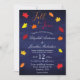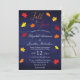 Fall in Love: Wedding invitation featuring maple and oak leaves in autumn harvest colours on a navy blue wood background