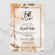 Beautiful fall flowers and leaves are featured on these real rose gold foil bordered autumn-themed Fall in Love bridal shower invitations.